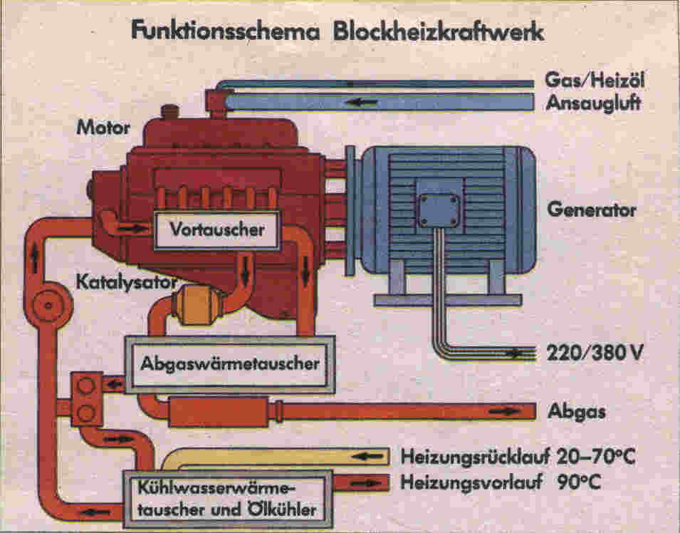 Das BHKW besteht aus einem herkömmlichen Dieselmotor (Industriemotor), der einen Generator zur Stromerzeugung antreibt. Während Kfz-Motoren die Abwärme ungenutzt an die Umwelt abgeben, wird sie beim BHKW mittels eines Wärmetauschers in Nutzenergie verwandelt.