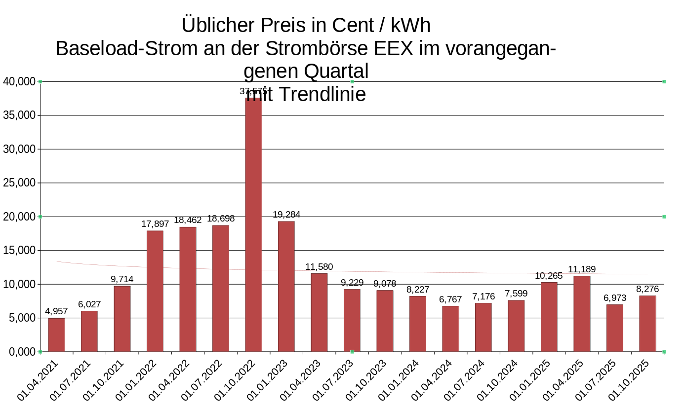 Der übliche Preis in Cent / kWh Baseload-Strom an der Strombörse EEX im vorangegangenen Quartal.
