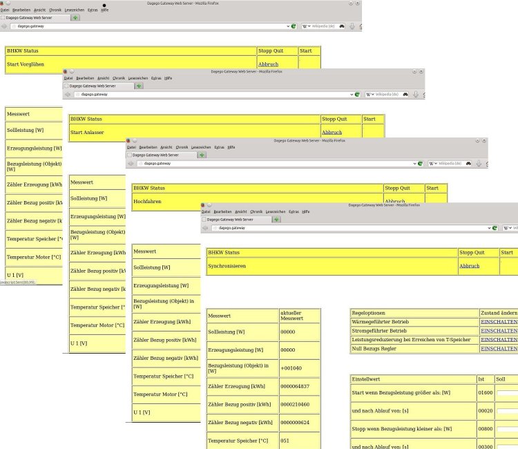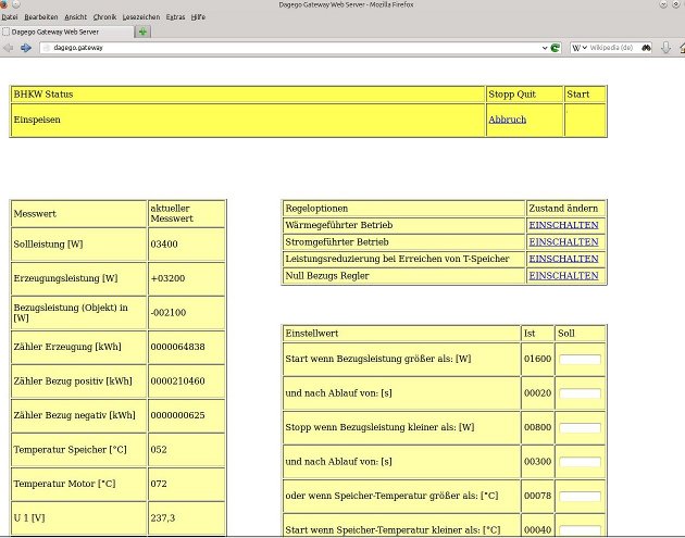 Unter der Statusleiste Links sind die aktuellen Messwerte vom BHKW zu sehen.