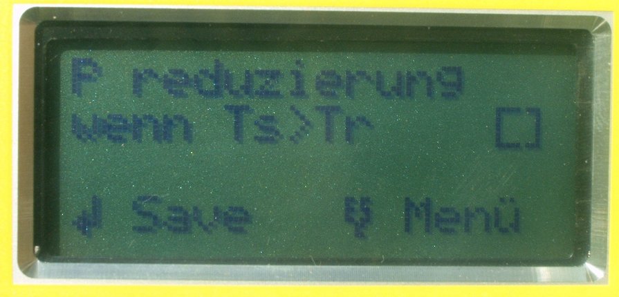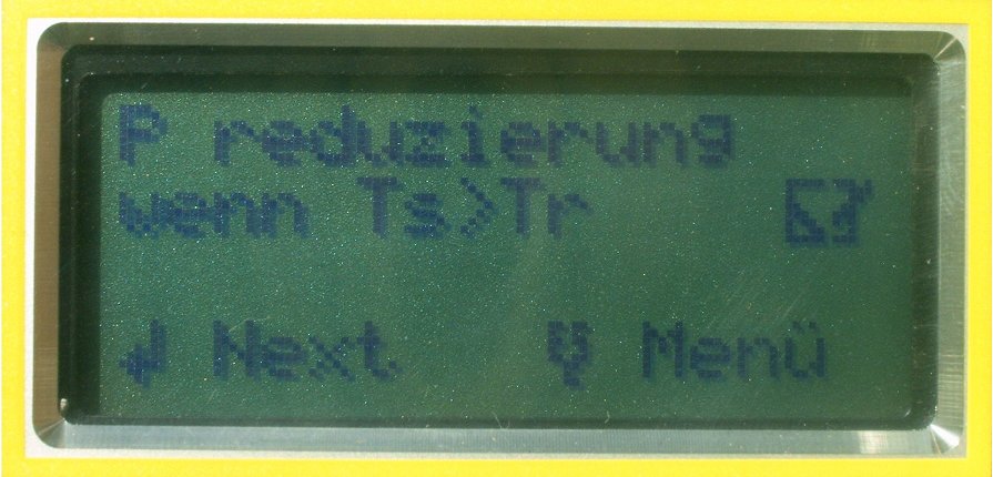 Der P-Temp-Regler ist mit Haken, daher eingeschaltet. Als Folge wird die P (Leistung) reduziert, wenn Ts (Temperatur im Speicher) größer ist als die eingestellte Temperatur Tr (Temperatur T-Reduzierung) Nach Drücken auf "Next" könnnen weitere Parameter dieser Funktion geändert werden.