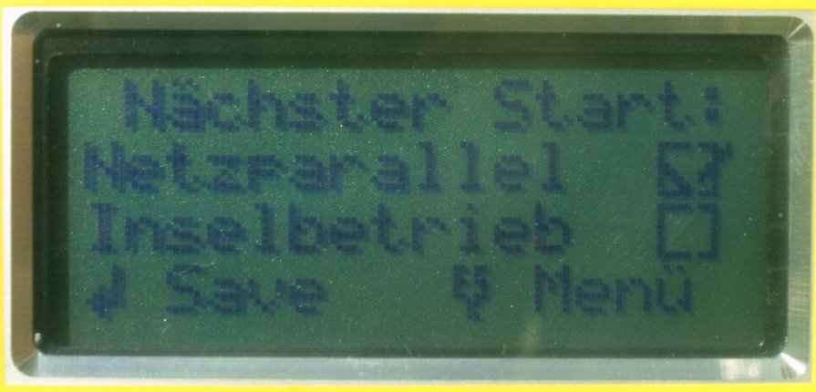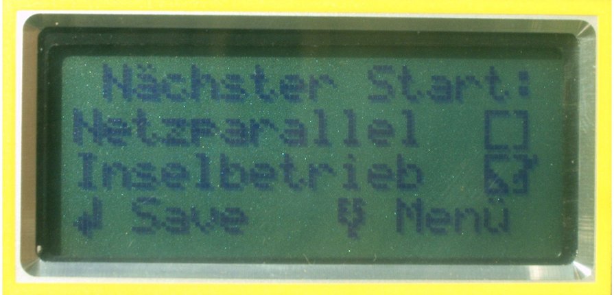 Komfortable Auswahl der Betriebsart Netzparallel oder Notstrombetrieb (Inselbetrieb) über die Tastatur.